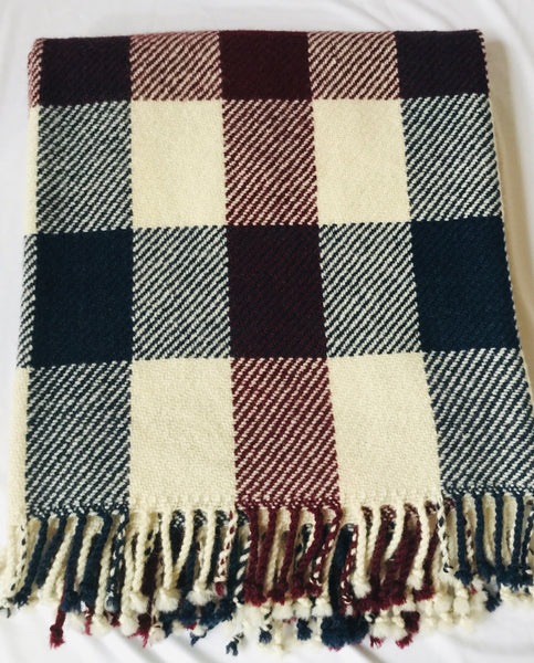 Handwoven Blanket made of Canadian wool - Burgundy, White, Navy Blue -Squares
